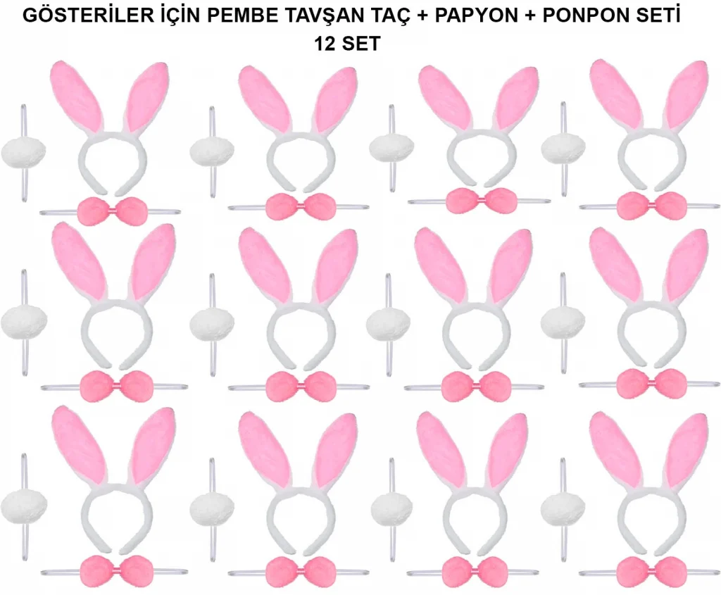 PEMBE TAVŞAN KOSTÜM SETİ – TAÇ, PAPYON, PONPON (12’Lİ PAKET)Ürün ÖzellikleriPembe Tavşan Kostüm Seti, 12'li paket halinde sunulur ve her set, sevimli bir tavşan görünümü için taç, papyon ve ponpon içerir. Pembe renkli tasarımıyla çocuklar için ideal olan bu set, kostüm partileri, okul etkinlikleri veya doğum günü kutlamaları gibi özel günlerde kullanılabilir. Her bir parça, rahat ve esnek malzemelerden üretilmiştir, böylece uzun süre rahatlıkla kullanılabilir. Set, grup etkinlikleri ve toplu kostüm etkinliklerinde kullanmak için mükemmel bir tercihtir.Paket İçeriği12 Adet Pembe Tavşan Kostüm Seti (Her Set: 1 Adet Taç, 1 Adet Papyon, 1 Adet Ponpon)