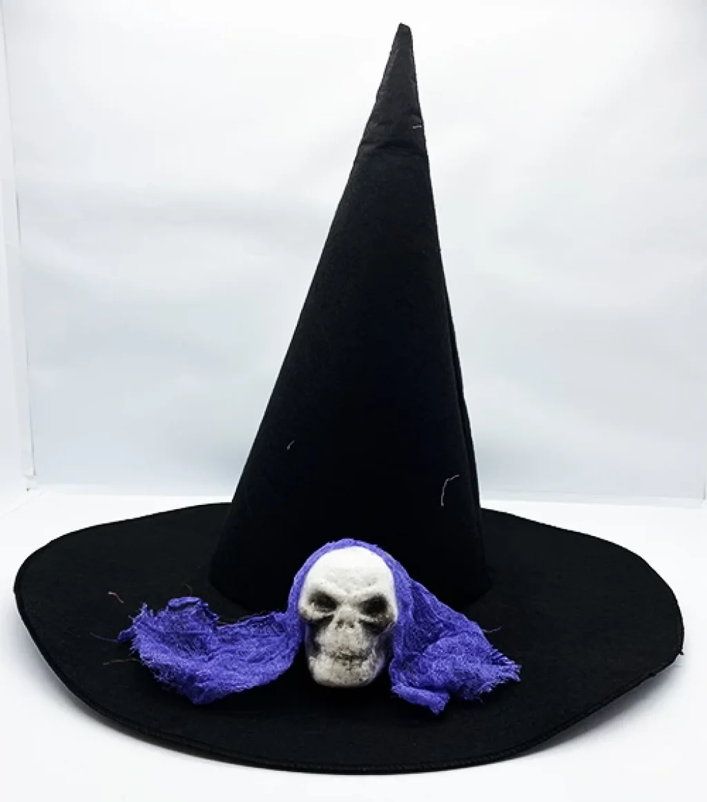Siyah Renk Mavi Duvaklı Kuru Kafa Temalı Cadı Şapkası 35x38 cm