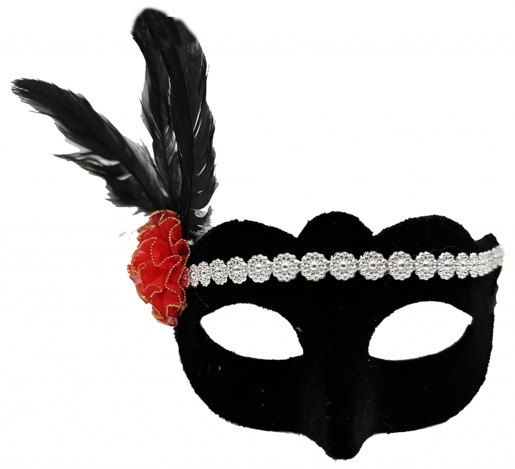 Siyah Renk Süet Kaplama Gümüş Dantelli Kırmızı Gül Tasarımlı Parti Maskesi 18x20 Cm