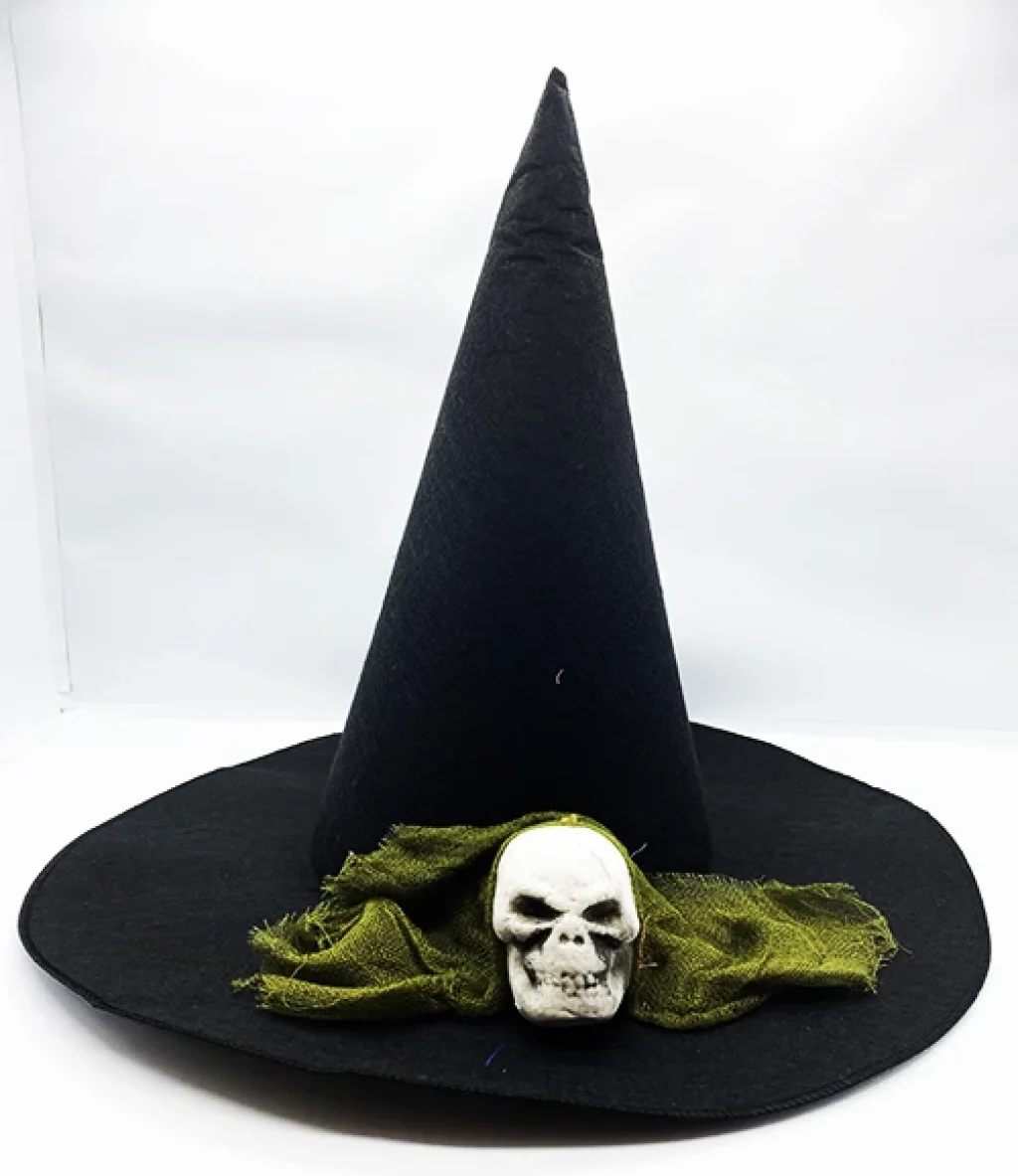 Siyah Renk Yeşil Duvaklı Kuru Kafa Temalı Cadı Şapkası 35x38 cm