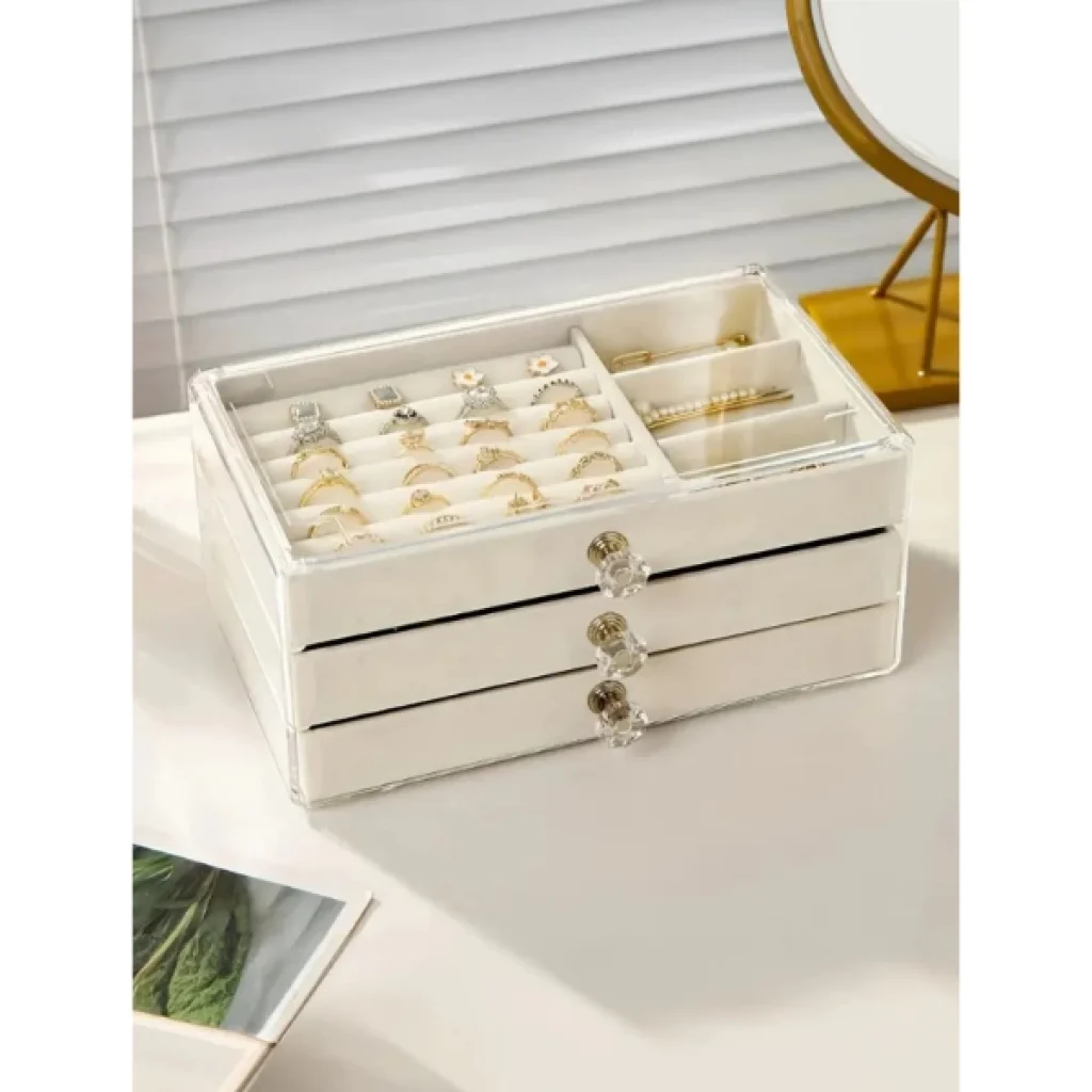 ÜÇ KATLI TAKI ORGANİZERİÜrün ÖzellikleriÜç Katlı Takı Organizeri, üç katlı çekmeceli tasarımı ile farklı türdeki takıların (yüzük, küpe, kolye, bileklik vb.) ayrı ayrı saklanmasına olanak tanır. Kadife kaplı iç bölmeler, takıların çizilmesini önler ve şık bir sunum sağlar. Saydam akrilik dış kapak, tozlanmayı engellerken içeriğin kolayca görünmesini sağlar. Kristal görünümlü çekmece kulpları ise dekoratif bir detay olarak tasarıma zarafet katar. Çok gözlü iç yapısı, küçük aksesuarların karışmadan düzenli bir şekilde durmasını sağlar. Bu düzenleyici kutular, hem evde takı organizasyonu sağlamak hem de makyaj masası veya komodin üzerinde dekoratif bir görünüm oluşturmak için idealdir.Paket İçeriği1 Adet Üç Katlı Takı Organizeri