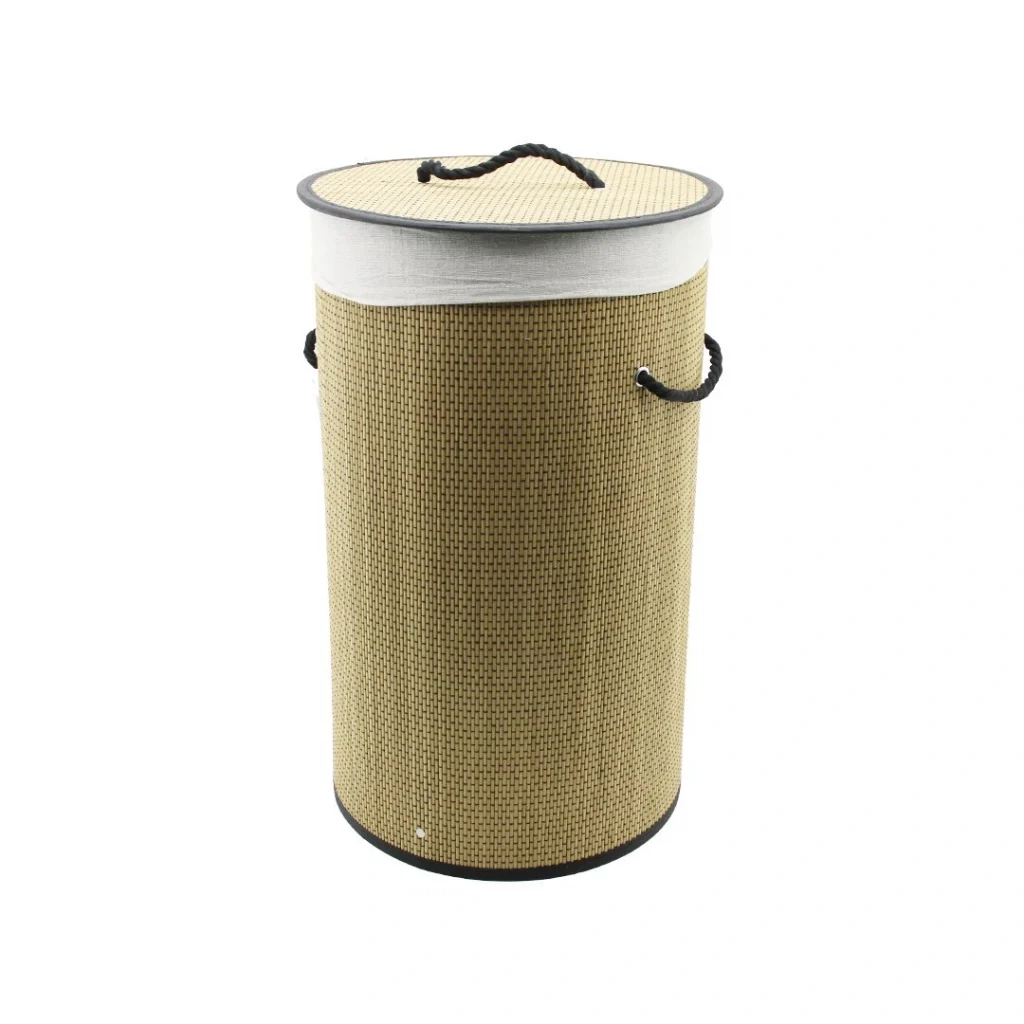 Yuvarlak Bambu Ahşap Kirli Çamaşır Sepeti 35x60cm Seyyar Kapaklı İçi Bezli İp Kulplu